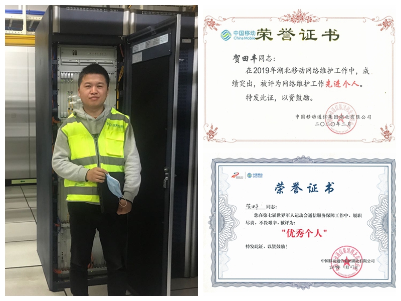 2016年贺田丰被调往中国移动随州分公司,从事应急通信管理、无线电管理工作,对接市政府职能部门,先后完成了寻根节、武汉军运会、孝感森林火灾、广水中华山森林火灾等重大通信保障,获得了孝感人民政府、广水人民政府及武汉军运会主办方的认可及感谢信。