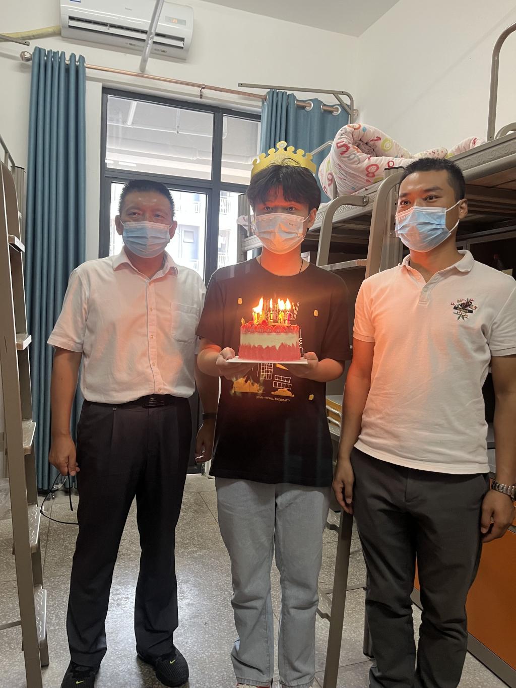 班主任白铮、徐振华为给学生制造惊喜,提前悄悄联系学生家长,一进宿舍,就用电脑播放由家长录制好的祝福视频。汽车工程学院党总支书记李先国为学生带来了生日礼物——襄阳牛肉面。汽车工程学院学工副院长魏赤文为新生点燃了生日蜡烛,大家共唱生日歌。
